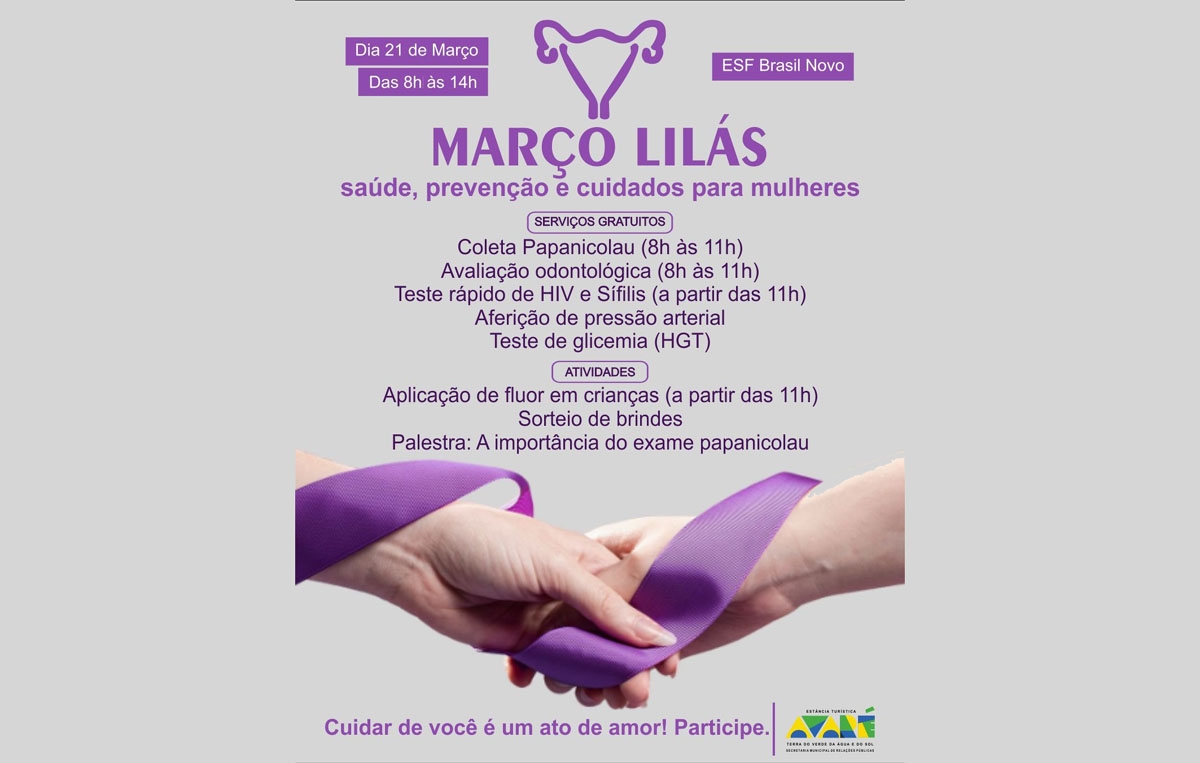 A saúde da mulher será o centro das atenções em Avaré com a realização do evento “Março Lilás”, uma ação especial da Secretaria de Saúde voltada ao cuidado, prevenção e bem-estar feminino. Mais uma iniciativa acontece no sábado, dia 21 de março, das 8h às 14h, no ESF Brasil Novo, reunindo uma série de atendimentos gratuitos e atividades de conscientização.