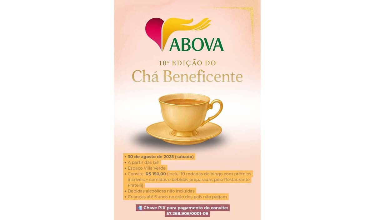 A Associação Beneficente Oncológica Voluntários de Avaré (ABOVA) promove neste sábado, dia 30, a 10ª Edição do Chá Beneficente que será apartir das 15h no Espaço Villa Verde.