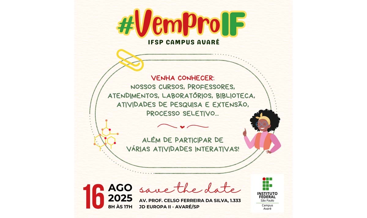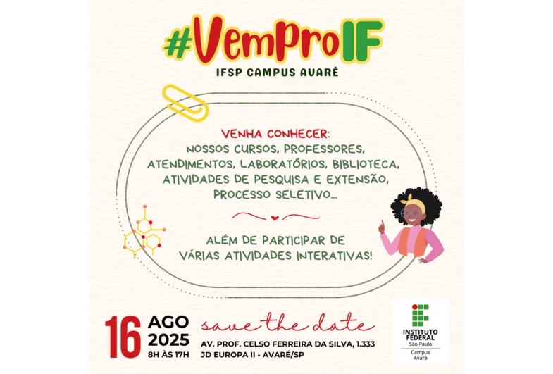 O evento “Vem pro IF” é realizado todos os anos pelo Campus Avaré do Instituto Federal de São Paulo - IFSP e tem como objetivo abrir as portas do campus à comunidade para que todos possam conhecer os cursos ofertados, suas atividades e infraestrutura.