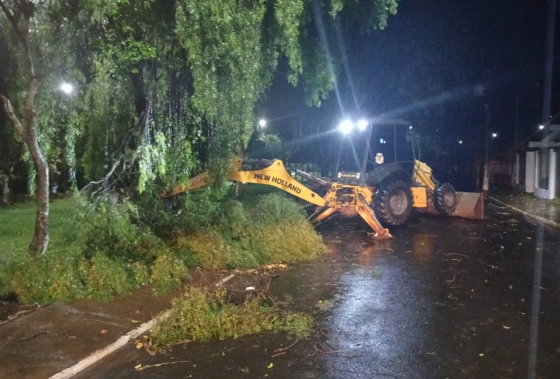 Ventos de até 100 km/h e chuva de 100 mm provocaram queda de árvores e danos em estruturas, mas não houve vítimas; equipes da Defesa Civil atuam desde a madrugada nos atendimentos.