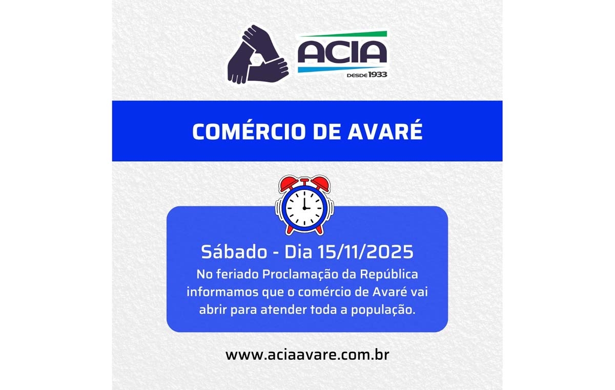 Neste sábado, 15 de novembro, feriado da Proclamação da República, o comércio de Avaré abrirá normalmente!