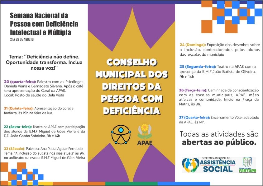 Conselho Minicipal dos Direitos da Pessoa com Deficiência junto com a APAE de Fartura promove palestras dos dias 20 a 28 de agosto, com o tema: "Deficiência não define. Oportunidade transforma. Inclua nossa voz!"