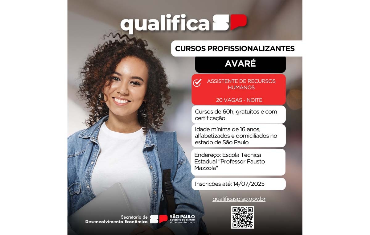 Inscrições - As inscrições seguem até 14 de julho pelo site qualificasp.sp.gov.br. A capacitação é gratuita, tem carga horária de 60 horas e fornece certificação ao final do curso