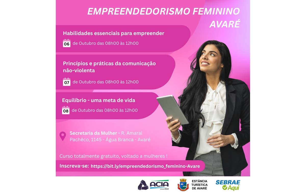 A programação acontece de 6 a 8 de outubro, das 8h às 12 horas, na sede da pasta. A iniciativa, que tem apoio do prefeito Roberto Araujo, é uma parceria com o SEBRAE e a Associação Comercial, Industrial e Agropecuária de Avaré (ACIA).
