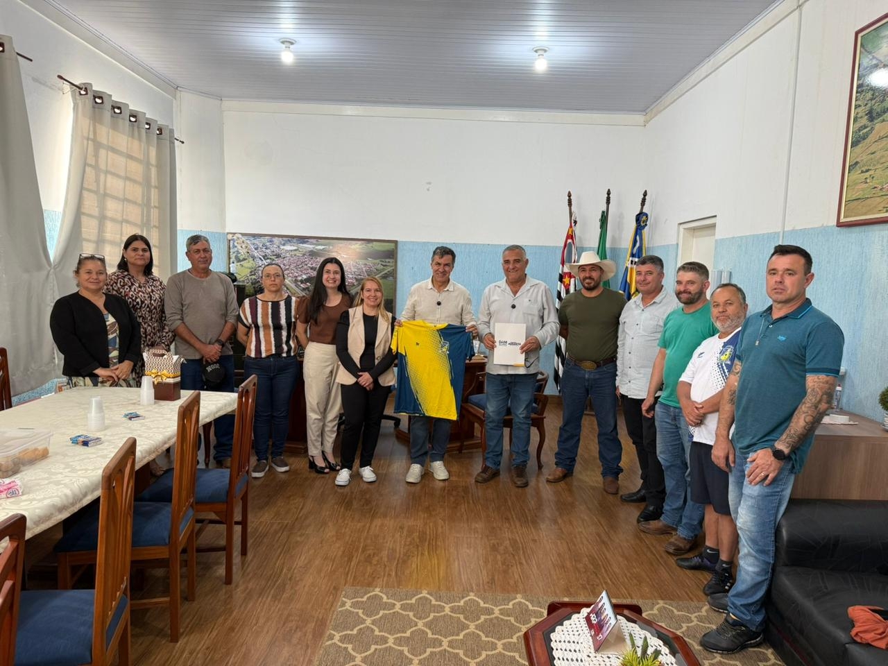 Em gesto de agradecimento e hospitalidade, o prefeito presenteou o parlamentar com uma camisa oficial da equipe de Sarutaiá que disputou os Jogos Regionais. A primeira-dama, Wilma, e Mariela, esposa do vice-prefeito Gango, também entregaram um buquê de rosas destinado à esposa do deputado, a deputada estadual Dani Alonso, que participou por chamada de vídeo e fez questão de agradecer pessoalmente a lembrança.