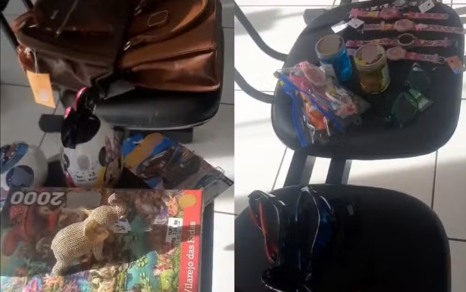 Nas imagens feitas pela Polícia Militar, entre os itens recuperados, estão doces, artigos de papelaria, roupas, bolsas, brinquedos, bijuterias, shampoo, condicionador e até utensílios de cozinha. Conforme o boletim de ocorrência, os prejuízos estimados das lojas superam R$ 4,7 mil.