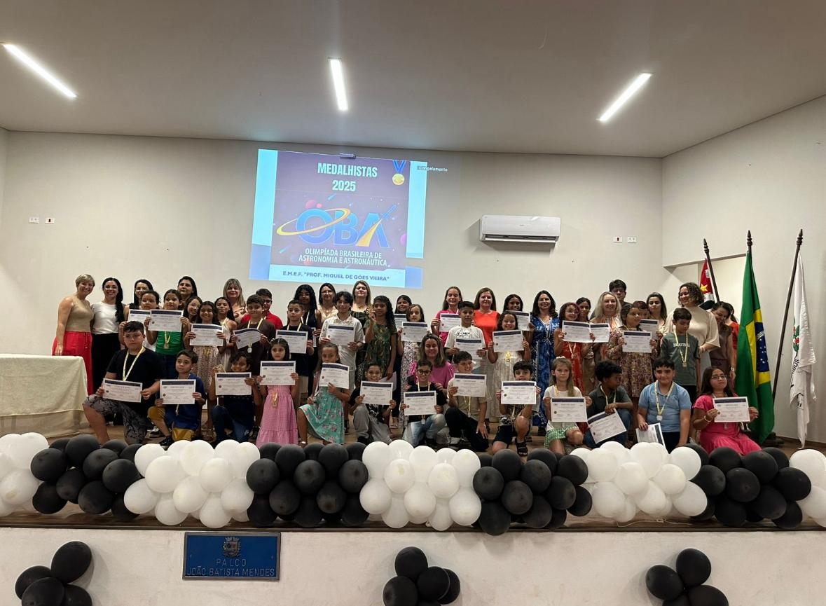 A Escola Miguel de Góes Vieira, da Rede Municipal de Ensino de Fartura, conquistou um resultado inédito e expressivo na Olimpíada Brasileira de Astronomia e Astronáutica (OBA 2025). Ao todo, foram 35 medalhas recebidas pelos estudantes, consolidando a escola como referência no incentivo à educação científica e tecnológica.