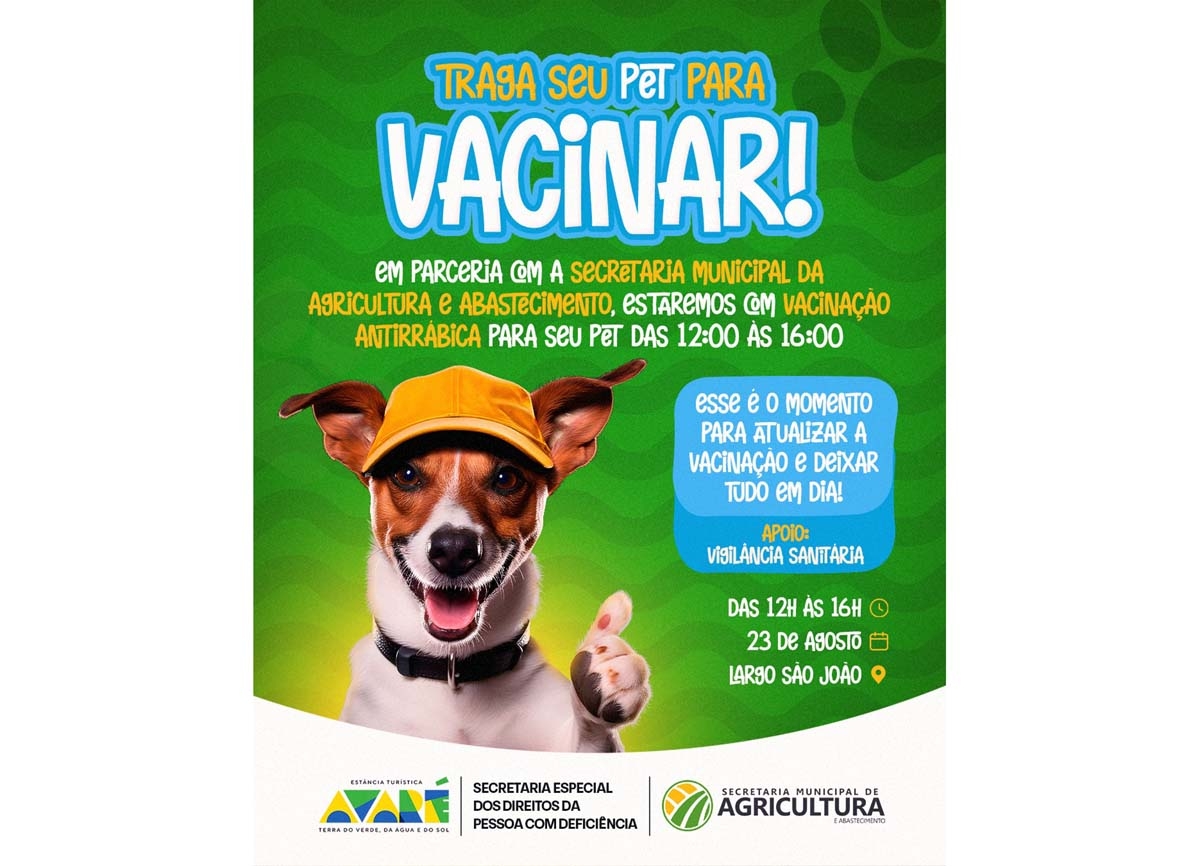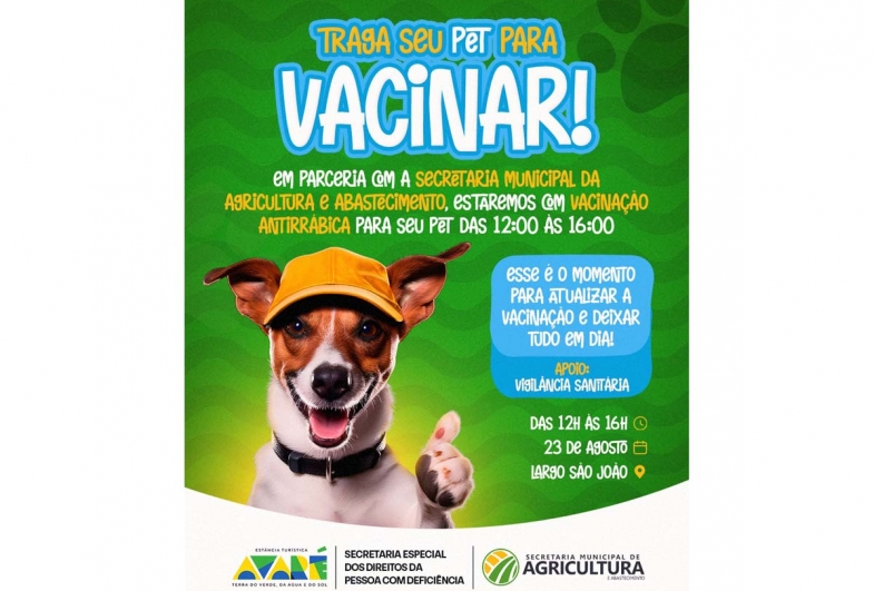 Também está prevista a vacinação antirrábica de pets das 12h às 14 horas, em parceria com a Secretaria Municipal de Agricultura e Abastecimento e apoio da Vigilância Sanitária.