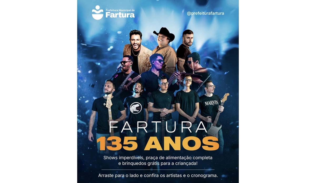 A Prefeitura de Fartura preparou uma programação especial para comemorar os 135 anos do município, com dois dias de festa que prometem reunir moradores e visitantes em um ambiente de celebração, música e lazer.