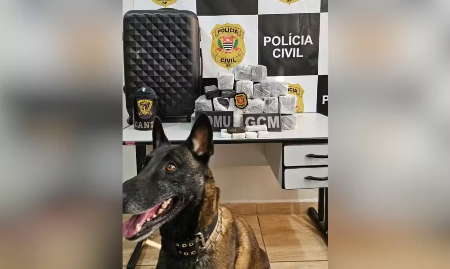 Cão da Guarda Civil Municipal de Itapeva indicou a mala durante operação em ônibus. Polícia Civil investigava transporte de drogas.