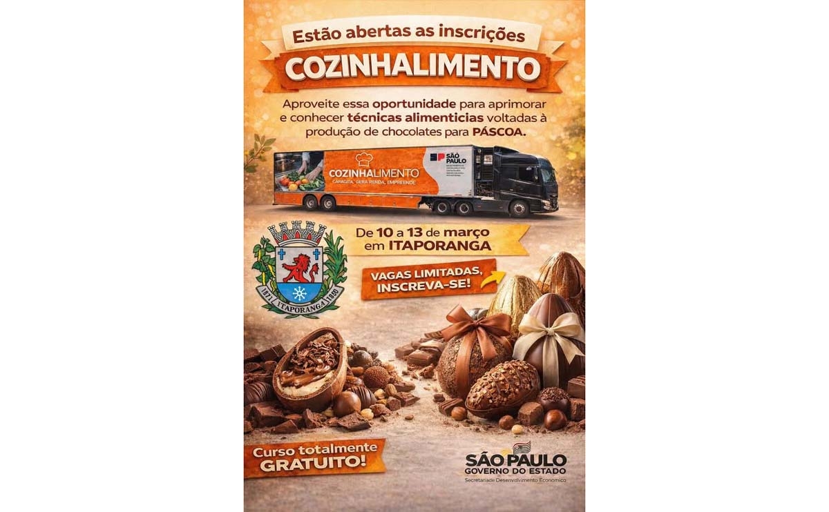 A Prefeitura de Itaporanga informa que o município receberá, entre os dias 10 e 13 de março de 2026, a Carreta CozinhAlimento, iniciativa do Governo do Estado de São Paulo que oferece capacitação profissional gratuita na área de alimentação. A ação é realizada por meio da Secretaria de Turismo e Cultura, em parceria com a Secretaria Municipal de Assistência Social e o Fundo Social de Solidariedade.
