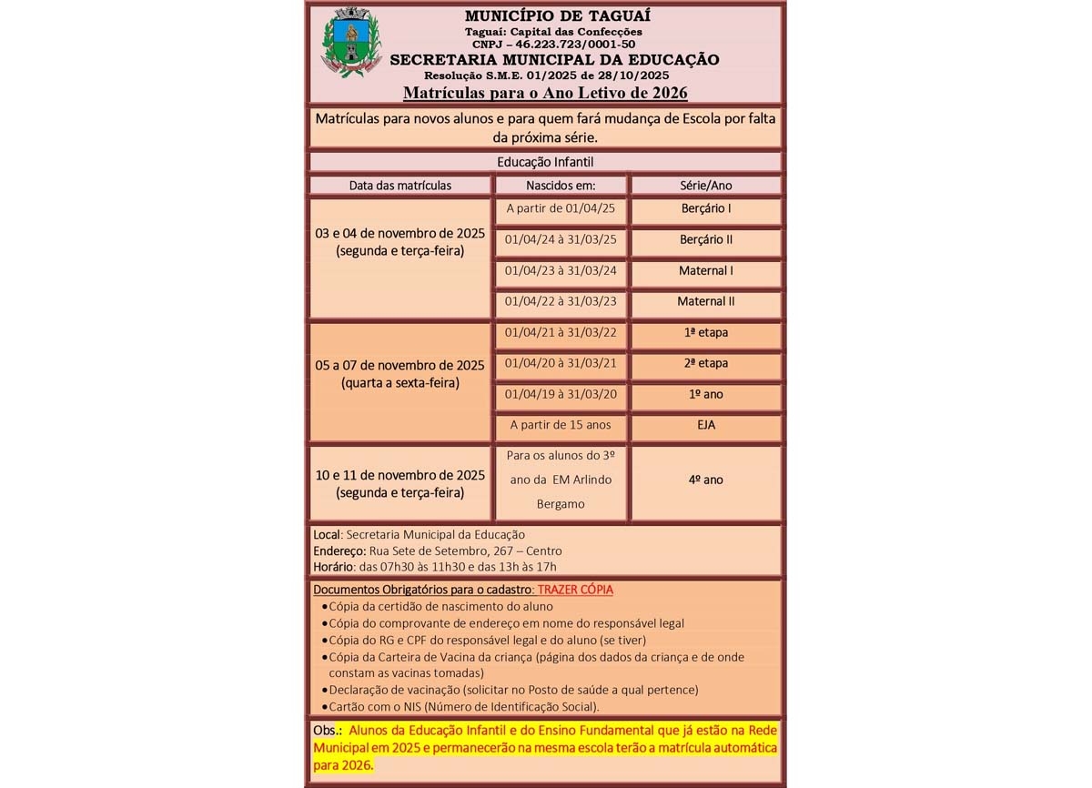 Matrículas para o Ano Letivo de 2026 de Taguaí
