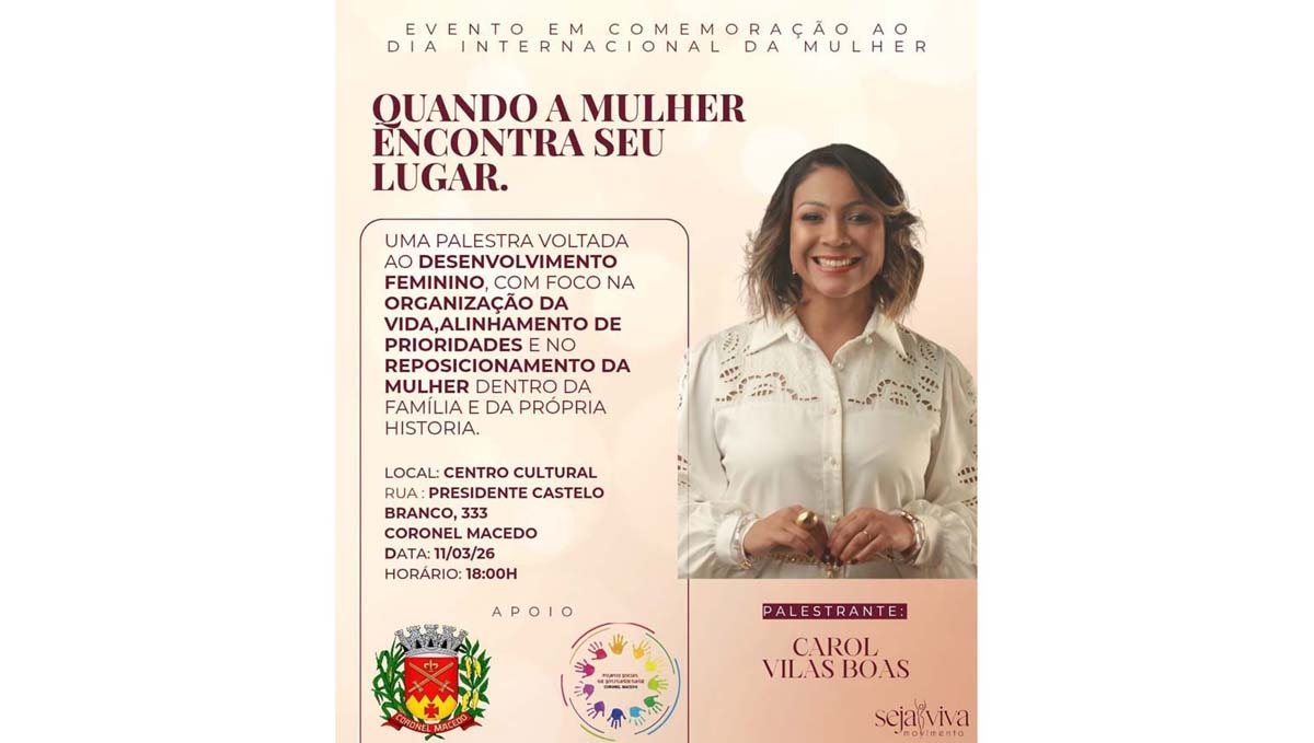 Em comemoração ao Dia Internacional da Mulher, será realizada em Coronel Macedo uma palestra especial com Carol Vilas Boas, voltada ao desenvolvimento feminino, organização de vida e alinhamento de prioridades.