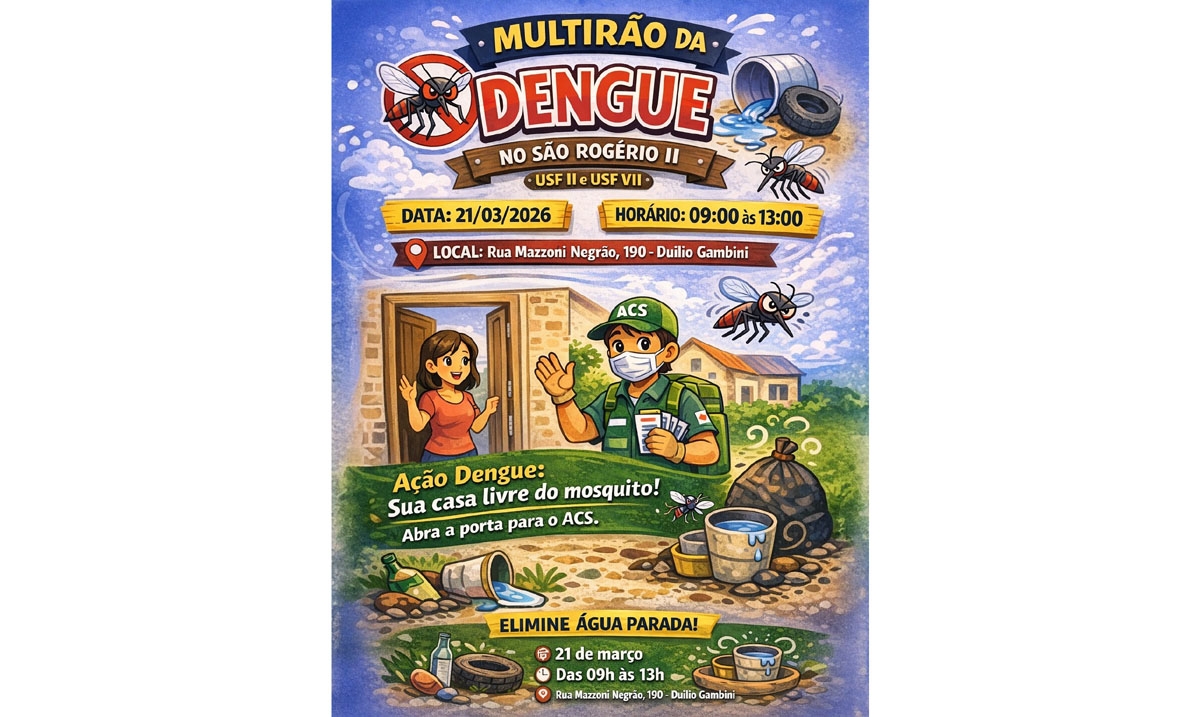 A iniciativa será realizada das 9h às 13h, com concentração na Rua Mazzoni Negrão, nº 190, no bairro Duílio Gambini, e contará com a atuação das equipes da USF II e USF VII, além do trabalho dos Agentes Comunitários de Saúde (ACS).