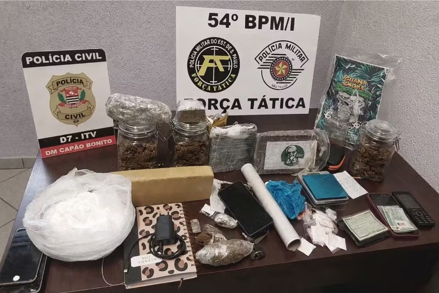 Ainda conforme a polícia, uma grande quantidade de drogas foi apreendida durante a operação, incluindo porções de cocaína e maconha. Uma motocicleta, uma balança e diversas embalagens plásticas também foram recolhidas.