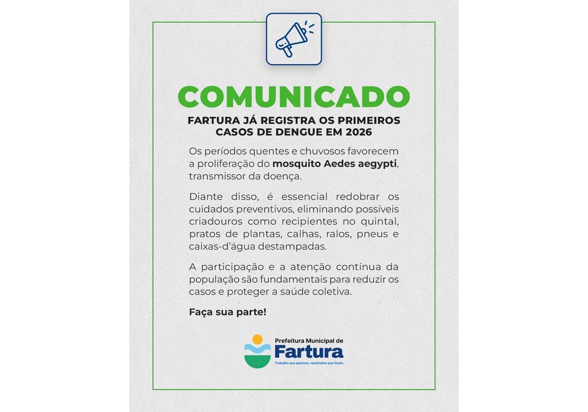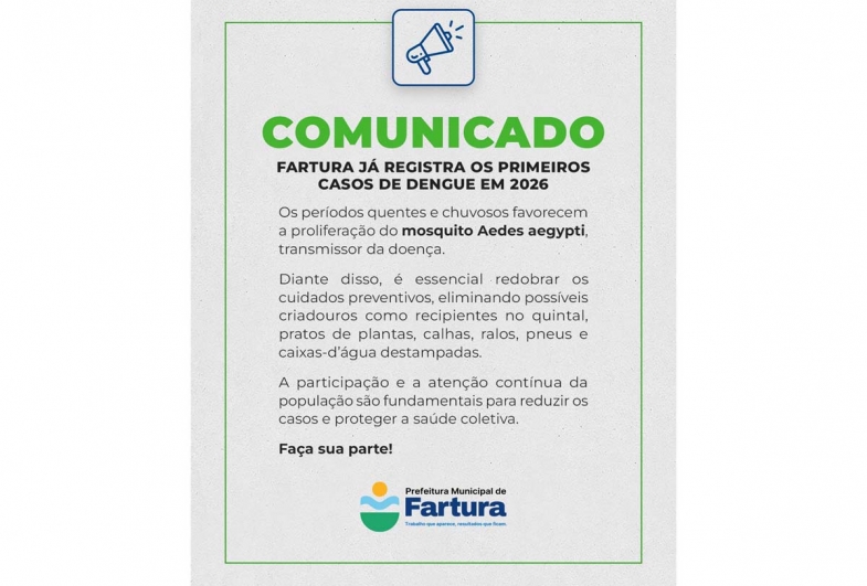 “A luta contra a dengue é uma responsabilidade de todos. Com cuidado, atenção e prevenção contínua, protegemos nossa cidade e a saúde da população”, reforçou a Prefeitura de Fartura.