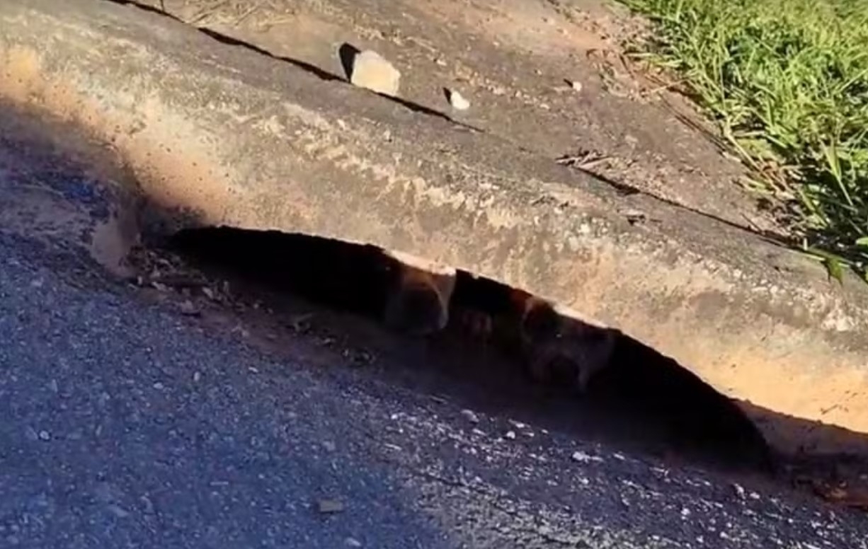Cães foram encontrados por moradores dentro de bueiro, na Vila Isabel, em Itapeva (SP). Servidores municipais que passavam pelo local improvisaram o resgate, na tarde de segunda (11).