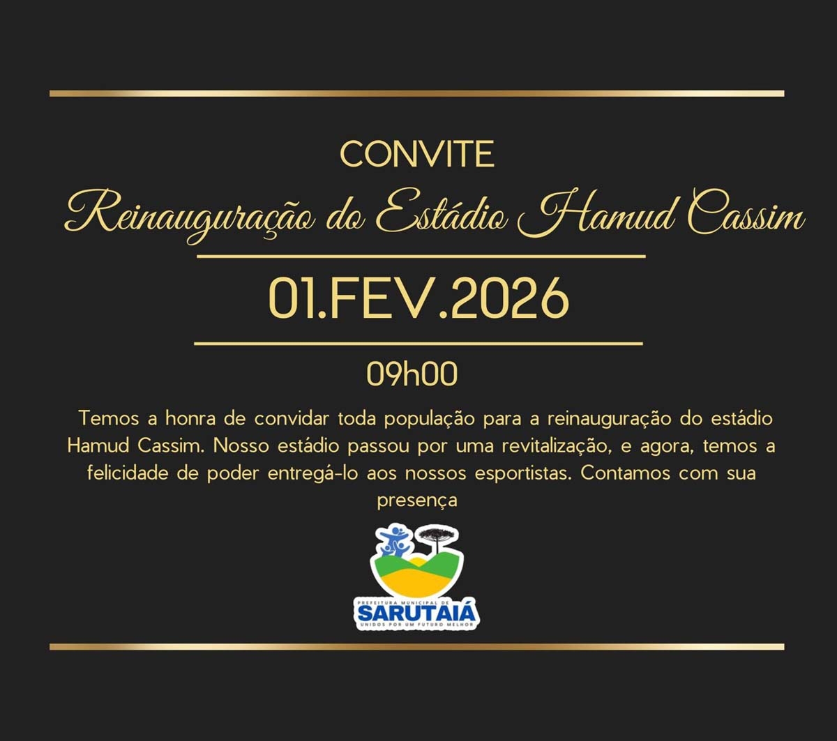 A reabertura do Estádio Hamud Cassim reforça o compromisso da administração municipal com o incentivo ao esporte, ao lazer e à qualidade dos espaços públicos, valorizando uma importante praça esportiva de Sarutaiá e promovendo integração social por meio do futebol.