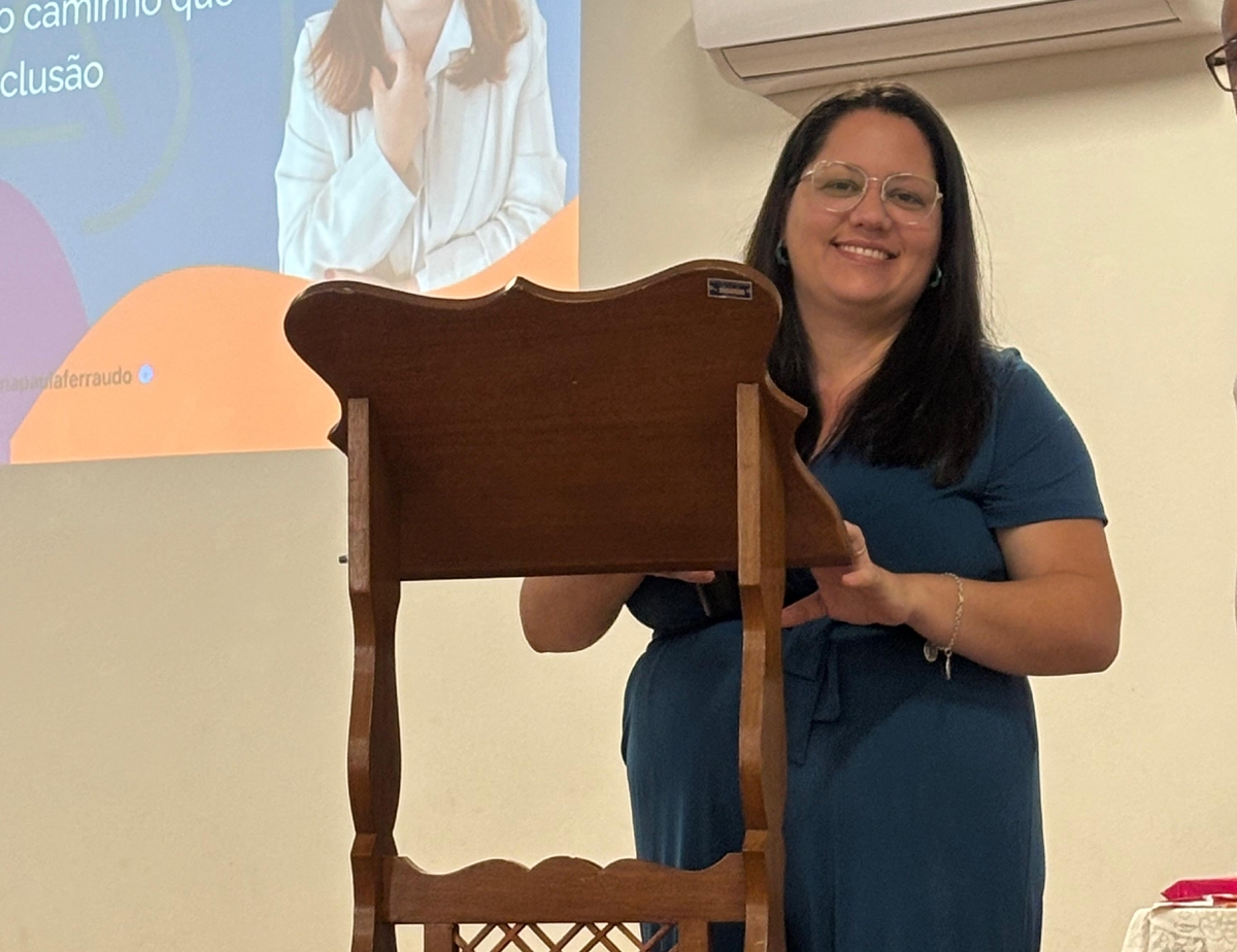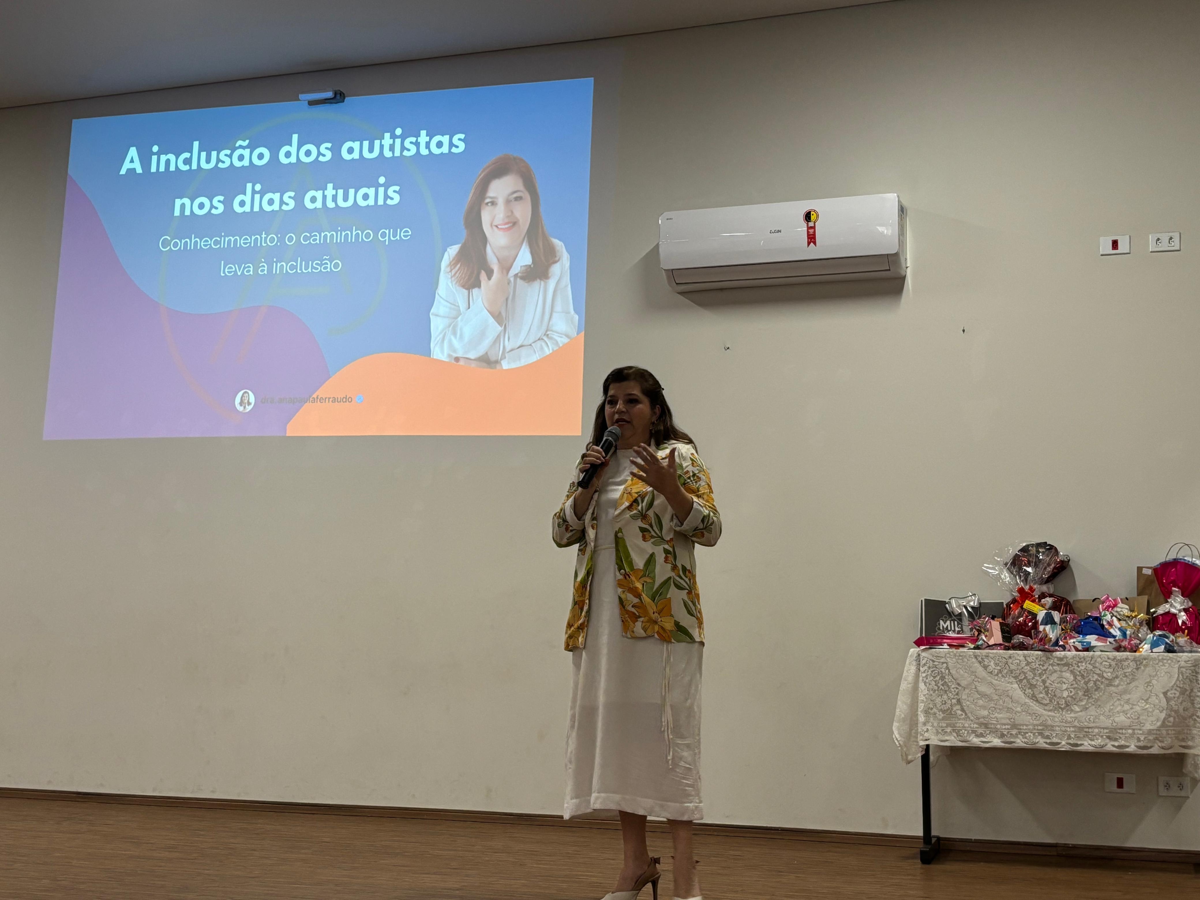 Durante a palestra, Ana Paula ressaltou a necessidade de uma educação inclusiva efetiva, que reconheça o potencial das pessoas com Transtorno do Espectro Autista (TEA) e assegure oportunidades de desenvolvimento, respeito e participação social.