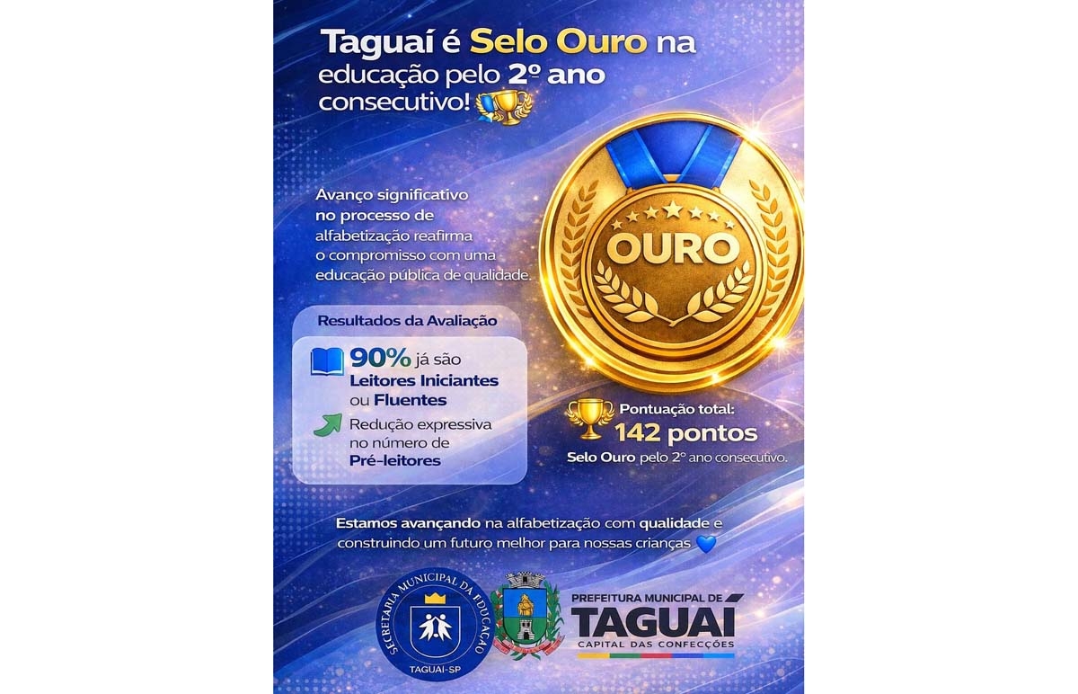 Taguaí foi reconhecido com o Selo Ouro do Compromisso Nacional Criança Alfabetizada, certificação concedida pelo Ministério da Educação (MEC) às redes de ensino que se destacam na implementação de políticas públicas eficazes de alfabetização.