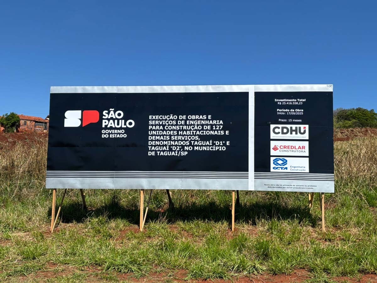 Taguaí iniciou nesta semana as obras do Conjunto Habitacional CDHU, após a autorização para a construção de 127 unidades habitacionais pelo Governo do Estado, oficializada em setembro. O projeto, que integra o Programa da Companhia de Desenvolvimento Habitacional e Urbano, deve beneficiar dezenas de famílias e tem previsão de entrega para o final de 2026.