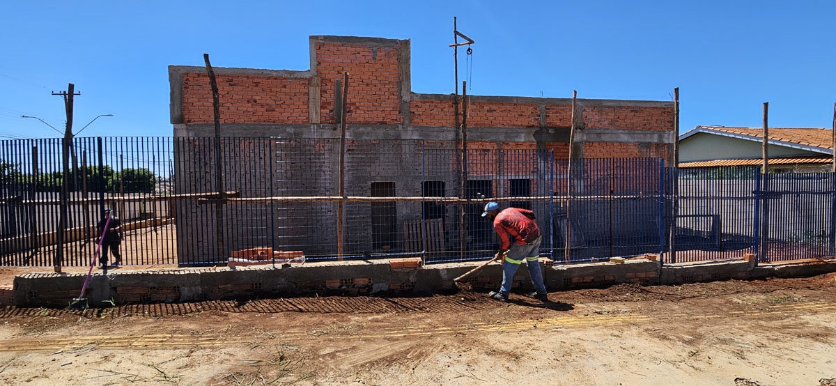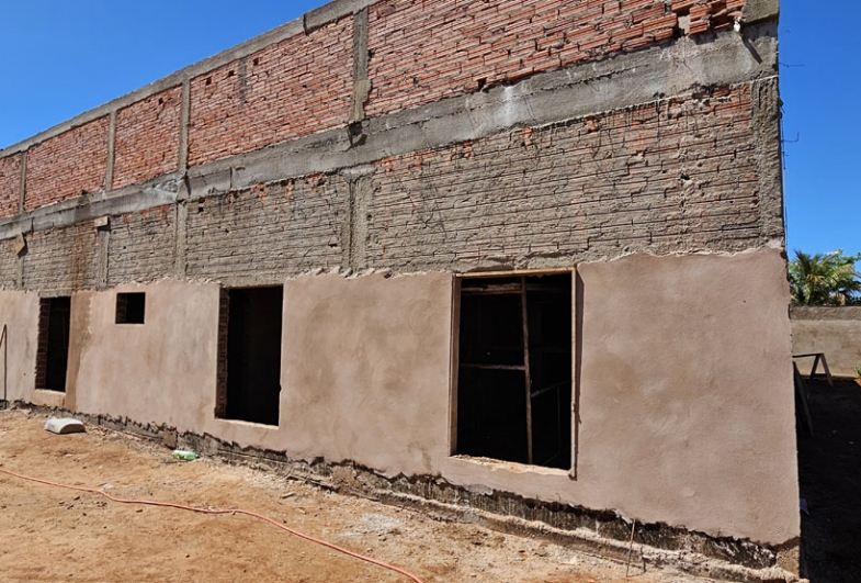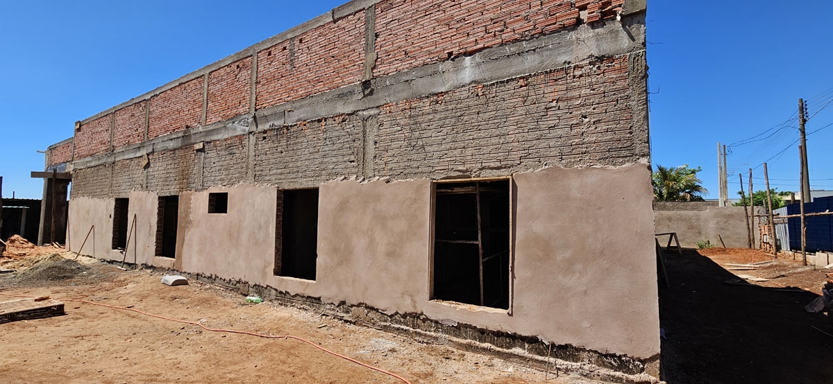 O imóvel já foi erguido e ganhou cobertura. Os trabalhos seguem com a instalação da parte hidráulica, a execução do reboco e de outras etapas previstas no projeto.